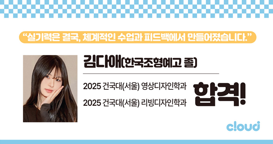 입시는 운도 중요하지만, 실력이라는 기반 없이는 결코 기회조차 잡을 수 없습니다. 클라우드미술학원에서 주어진 한정된 시간 안에 자신을 다듬고 끝까지 버텨낸다면, 저보다 훨씬 좋은 결과도 분명히 가능할 거라 믿습니다. 후배 여러분의 도전을 진심으로 응원합니다.