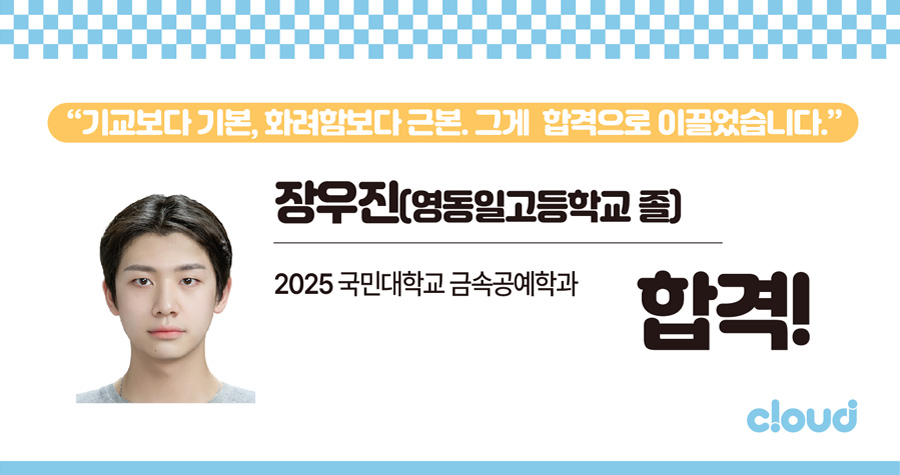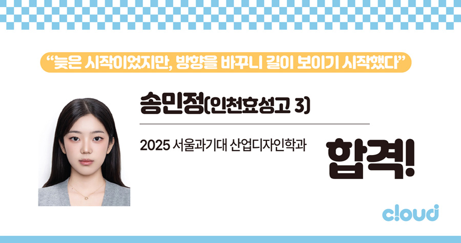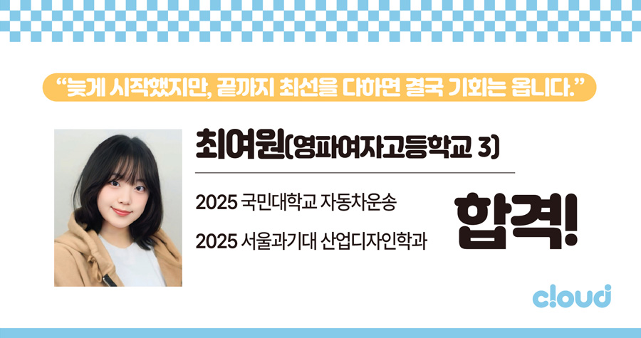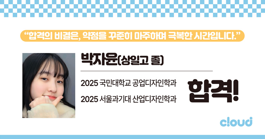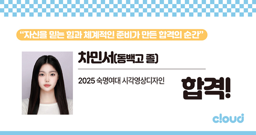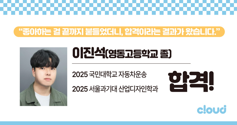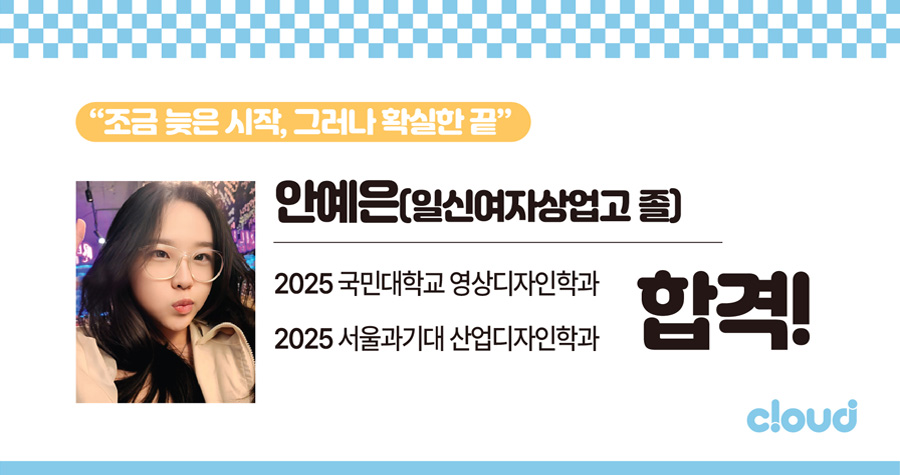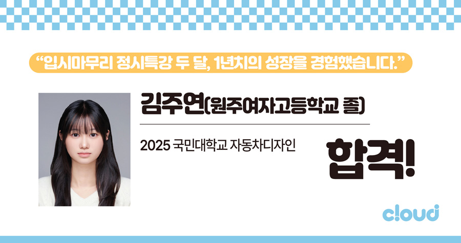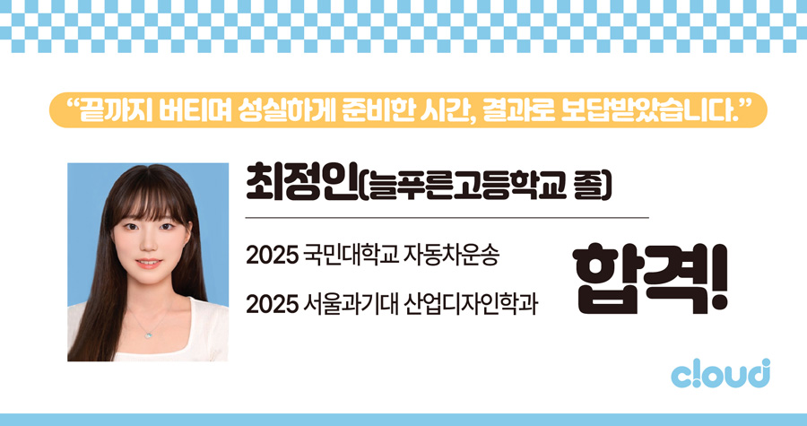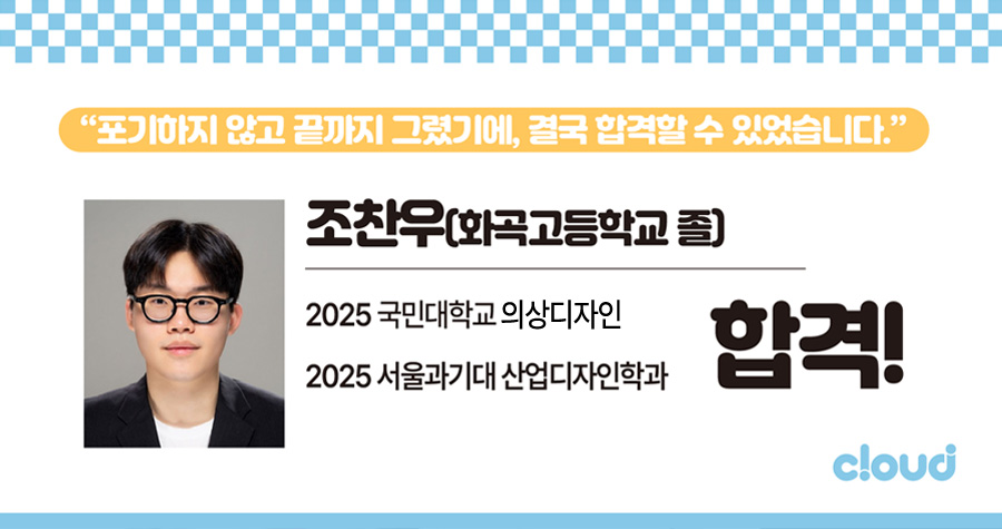 처음엔 미술을 단순한 취미로만 생각했지만, 어느 날 SNS에서 입시미술 영상을 접하고 ‘나도 한 번쯤 도전해보고 싶다’는 생각이 들었습니다. 더 늦기 전에 시작하자는 마음으로 고등학교 2학년 때 본격적인 입시미술을 시작하게 되었습니다. 클라우드 연계 학원에서 수업을 듣던 중, 보다 집중도 높은 정시 특강과 체계적인 기초소양 수업을 듣기 위해 강남 클라우드 본원에서 수업을 받게 되었습니다. 본원에서는 대학별 출제 유형에 따라 수업 방식이 명확히 구분되어 있어, 국민대 유형에 익숙하지 않았던 저에게도 단계별로 차근차근 접근할 수 있는 유익한 커리큘럼이었습니다. 국민대학교 유형을 본격적으로 연습한 것은 정시특강 기간이 처음이었지만, 두 달 동안 국민대 스타일에 맞춘 실기 연습과 나만의 표현 공식을 만들어가는 과정은 매우 효과적이었습니다. 시험 문제에서 중요한 키워드를 잡아내는 연습을 꾸준히 했던 것이, 실전에서 당황하지 않고 그림을 그릴 수 있는 힘이 되었습니다. 국민대학교 실기시험이 제 첫 시험이었기에 긴장감이 컸지만, 백근영 선생님께서 해주신 “간절히 그리면 붙을 수 있다”는 말이 큰 위로이자 동기부여가 되었습니다. 결국 시험장에서도 배운 대로, 그리고 할 수 있는 최선을 다해 그림을 완성하고 나올 수 있었습니다. 어릴 때부터 좋아했던 미술을 진로로 삼게 된 결정적인 계기는 부모님의 조언이었습니다. “더 늦기 전에 도전해보라”는 격려에 힘입어 시작한 입시미술, 그리고 ‘자동차와 운송기기’라는 특화된 분야에 매력을 느껴 자동차운송디자인학과를 지원하게 되었습니다. 정시특강 기간 동안 처음 뵌 이광재 선생님께서 수업 시간마다 이전 개념들을 복습하듯 설명해 주셔서 무리 없이 따라갈 수 있었고, 평가 때마다 주신 피드백을 꾸준히 정리하고 적용하며 실력을 끌어올릴 수 있었습니다. 마지막 연합평가 때는 누구보다 좋은 결과를 내고 싶어서 매일 한 시간씩 일찍 나와 그림 준비를 했던 것도 제겐 큰 전환점이 되었습니다. 후배들에게 전하고 싶은 말은, 수능이 끝나고 지친 마음이 들겠지만 지금 이 시기에 현실적인 목표를 잡고 꾸준히 달리면 누구든 합격할 수 있다는 것을 꼭 기억하길 바랍니다. 짧지만 굵었던 두 달. 강남 클라우드미술학원에서 보낸 시간은 1년만큼이나 값진 시간이었습니다. 이 자리를 빌려 진심으로 감사드립니다.2025