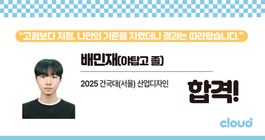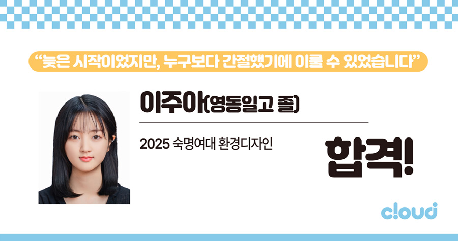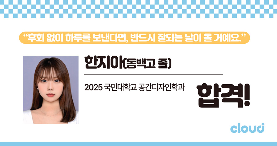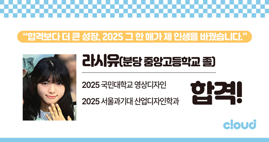 후배 여러분, 1년 전 저는 수능 마킹 실수, 학원 문제, 친구들과의 이별 등으로 정신적으로 가장 힘든 시간을 보내고 있었습니다. 그 상황에서도 클라우드 학원에서 다시 마음을 잡고, 끝까지 흔들리지 않고 그림을 완성해내는 연습을 한 것이 결국 합격이라는 결과를 안겨줬습니다. 합격 발표 전날까지도 기대하지 못했던 결과였지만, 대학에 와서 제가 좋아하는 공부를 하며 하루하루를 즐겁게 보내고 있습니다.
